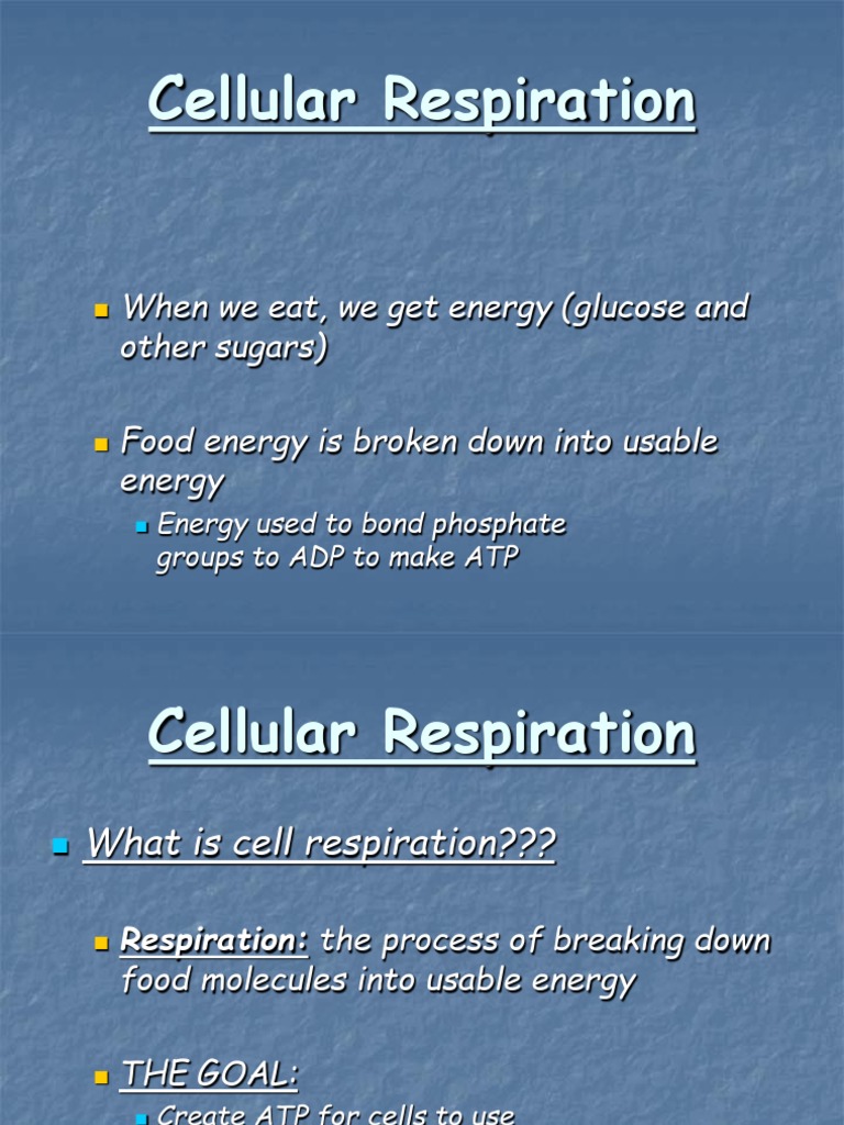 Respiration occurs when glucose (sugar produced during photosynthesis) combines with oxygen to produce useable cellular energy. Respiration is a vital way for the cells of plants and animals to obtain and utilize energy. So we already know that if we start off with a glucose molecule we start off with a glucose molecule which is a six carbon molecule six carbon molecule that this essentially gets split in half by glycolysis and we end up with two pyruvic acids or two pyruvate molecules so glycolysis literally splits this in half it lysa's the glucose and we end up with two pyruvates or pyruvic acids pyruvate. Glucose is decomposed to carbon dioxide and water during cellular respiration. The lungs dispose of the carbon dioxide, left there by the red blood cells, in the process of breathing. Without this energy, cells in the bodies of plants and animals would fail to function and will eventually break down and die. This energy is used to fuel growth and all of the normal cellular functions. • during the breathing, exchange of gasses (oxygen and carbon dioxide) take place. In cellular respiration the blood cells release oxygen and pick up carbon dioxide. Cellular respiration also releases carbon dioxide into the atmosphere allowing plants, algae, and bacteria to process the carbon dioxide back into oxygen. • breathing is a physical process, whereas cellular respiration is a biochemical process. Photosnythesis and cellular respiration is a life cycle that keeps the natural ecological balance of the earth in place. However, the cellular respiration equation represents the main components of this process that are common among most organisms.